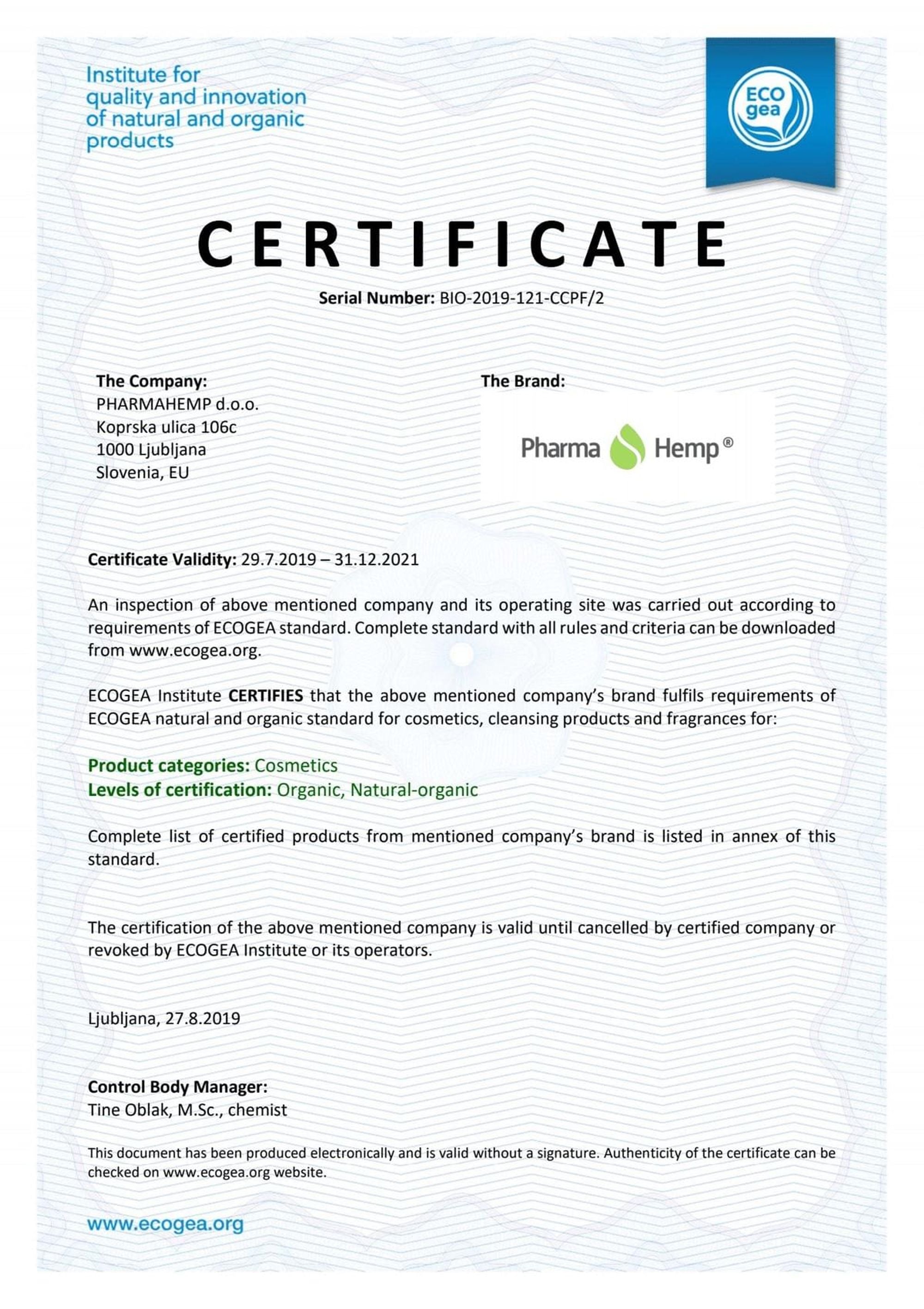 Pharma Hemp社の製造する製品が、エコギアが推奨する原材料・製造過程においてナチュラルオーガニック認証されていることを証明するものです。