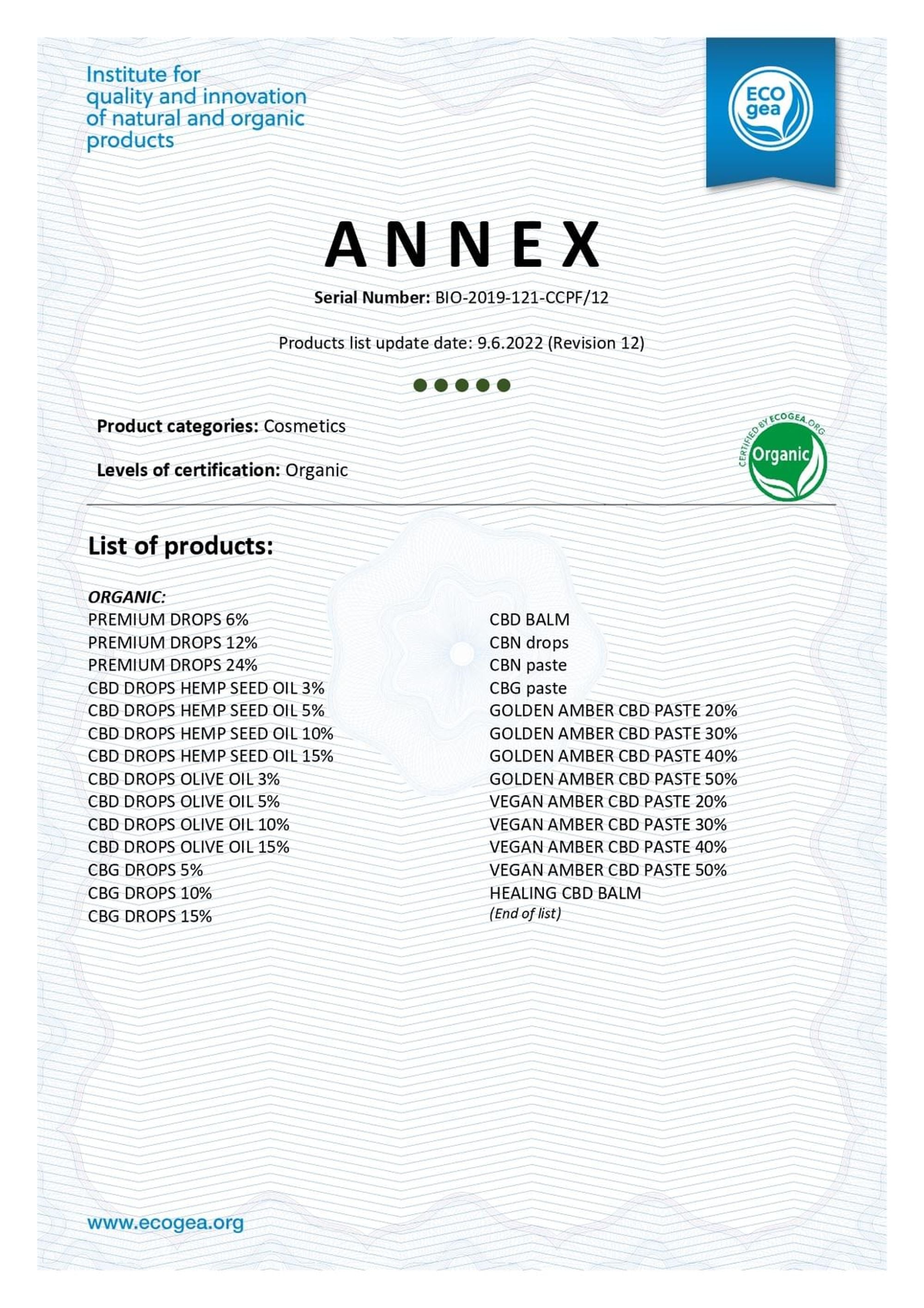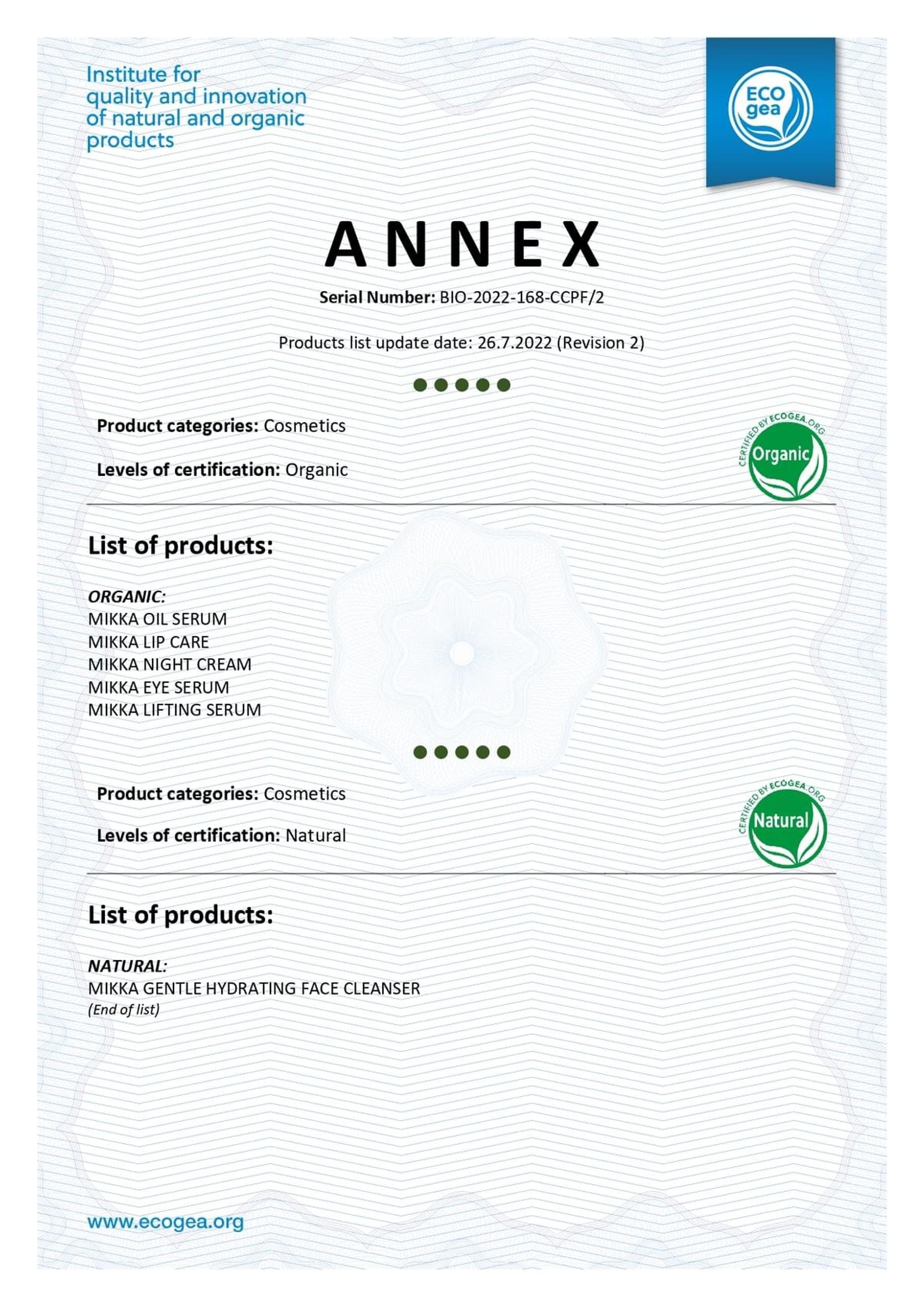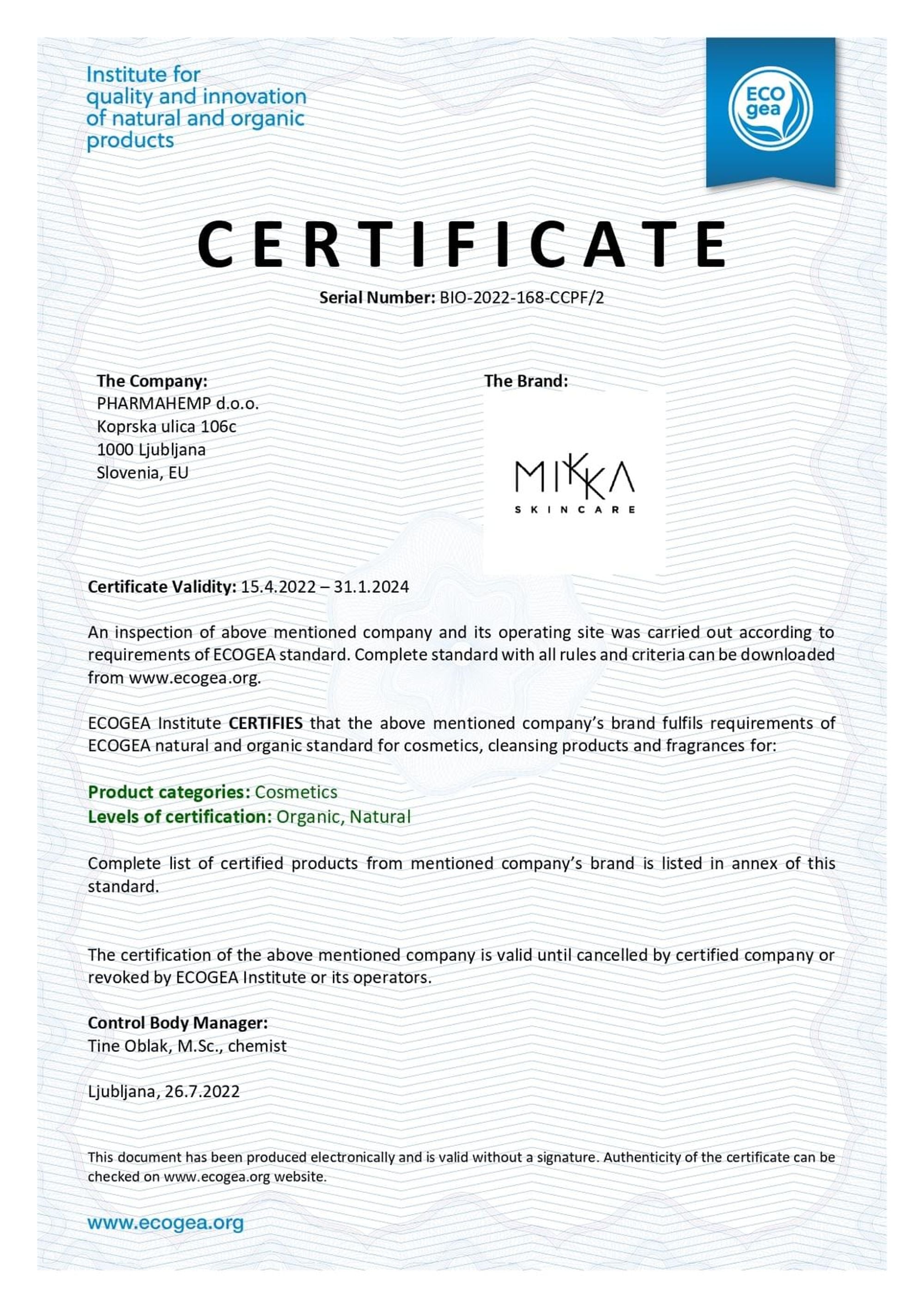 Pharma Hemp社のMIKKA 製造する製品が、エコギアが推奨する原材料・製造過程においてナチュラルオーガニック認証されていることを証明するものです。